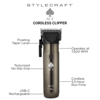 It’s no bluff—the StyleCraft Ace Cordless Hair Clipper is the ultimate tool for those who take their grooming seriously. This clipper is the royal flush of at-home hair clippers, bringing durability, ease of control, and superior comfort together in one winning hand. Users will love the 7,500 RPM motor, which powers through the most challenging hair with high speed, low noise, and a close shave for a smooth finish. No need to gamble with subpar performance—this clipper is engineered to deliver consistent, reliable results with every use. The Lithium-ion battery provides double the standard run-time, offering 3.5 hours for trimming, fading, and styling without worrying about losing power. With USB-C rechargeability, it’s always ready for both avid travelers and homebodies alike. The StyleCraft Ace Cordless Hair Clipper’s superior durability and precision come from the combination of a fixed high-carbon steel blade and a ceramic cutting blade that stays cooler during use. This reduces friction and chances of snagging while minimizing heat, allowing users to play the grooming game without discomfort. The texturized no-slip side grip provides extra control, making it easy to handle, even in the most delicate or hard-to-reach spots. Whether shaping up facial hair or trimming a little of the top, precision is guaranteed. This cordless hair clipper is the winning hand for grooming that never folds. With durability, performance, and style at hand, this clipper is built for those who always bet on the best.